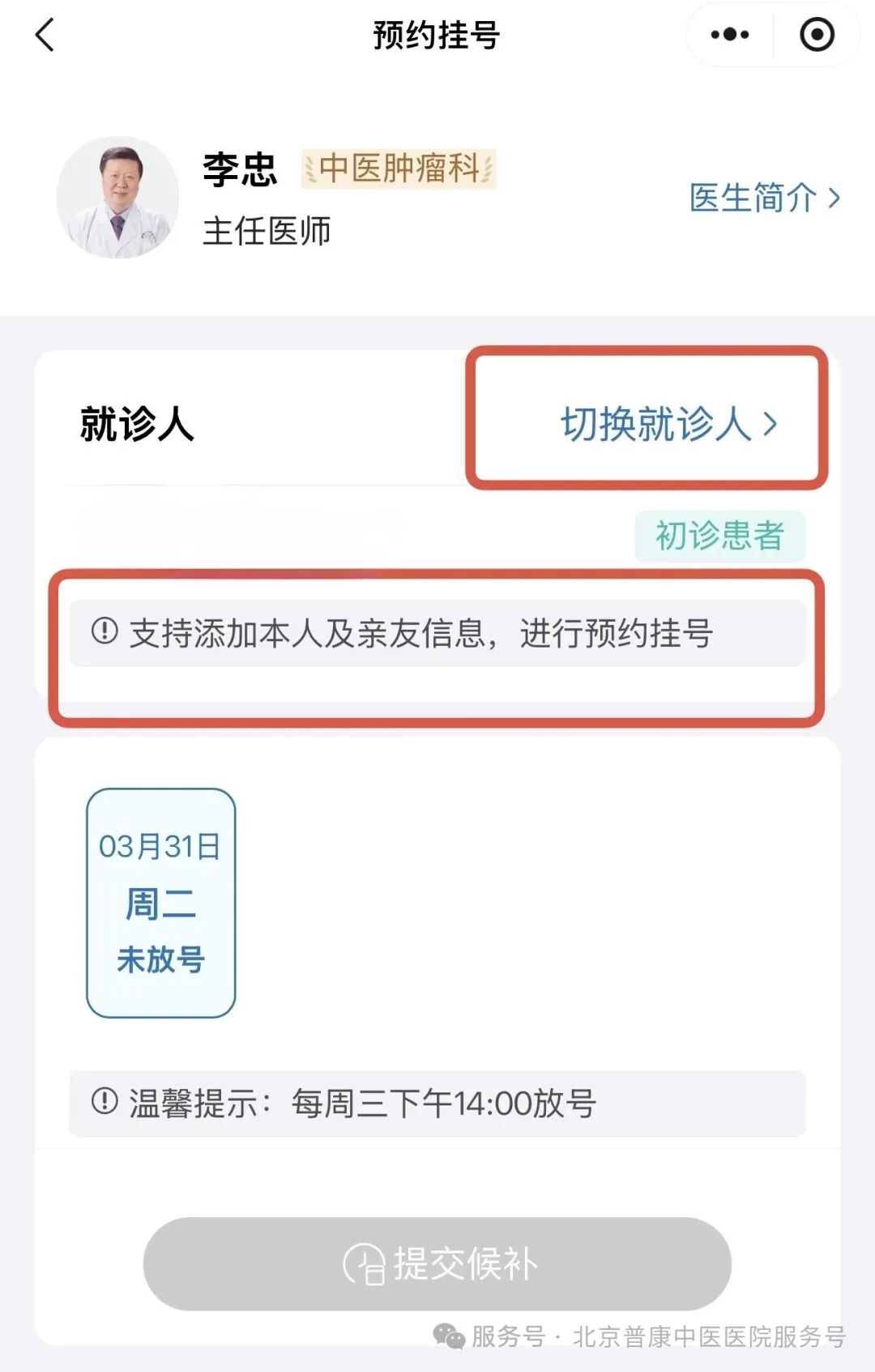 若预约时间暂无号源,可点「提交候补」继续预约。