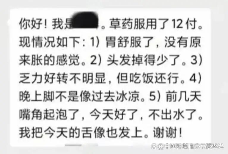 患者一:肠癌患者服中药12付后,胃胀消失,食欲变好,脚不冰了,头发也掉的少了。